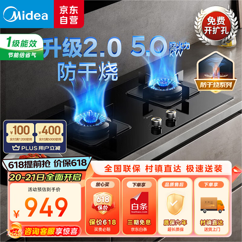 美的(Midea)美颐享 燃气灶液化气 双灶具 家用防干烧5.0kW猛火灶台嵌两用 安防灶 Q36S价格:949.00元!