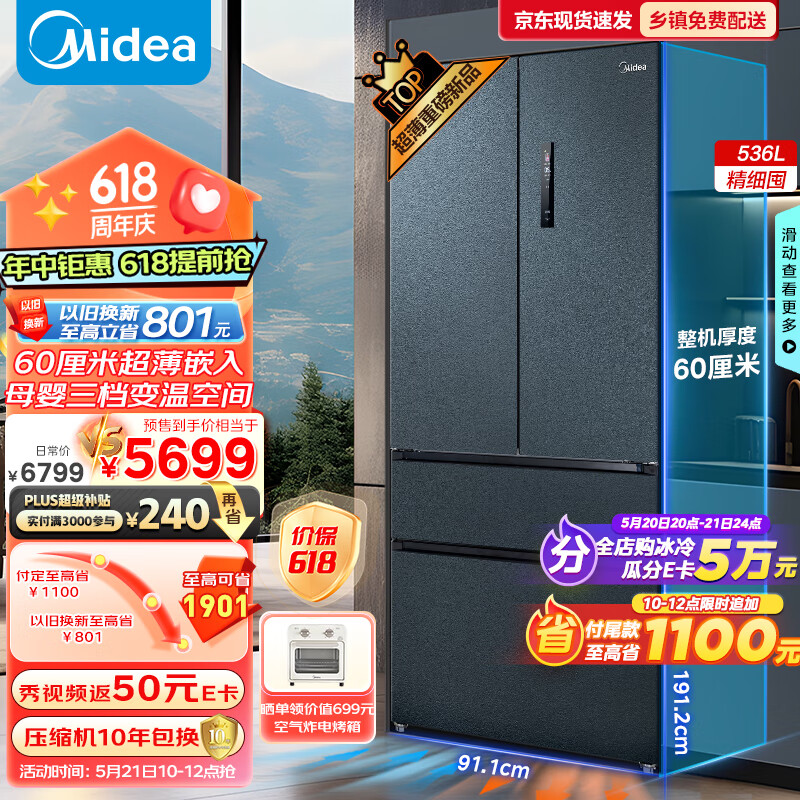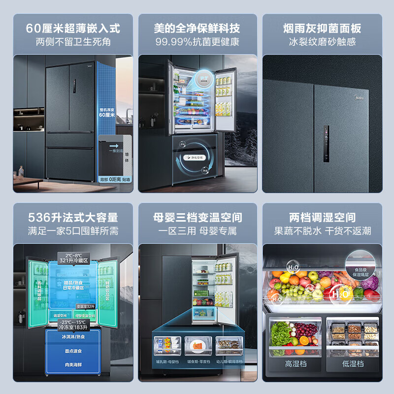 美的(Midea)M60系列562法式多门四开门超薄零嵌入式平嵌一级变频风冷无霜大容量家用电冰箱智能MR-562WUFPZE价格:6799.00元!