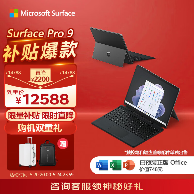 微软Surface Pro 9 二合一平板电脑i7/16G/512G 石墨灰13英寸触控高端商务办公笔记本轻薄本笔记本电脑价格:12588.00元!