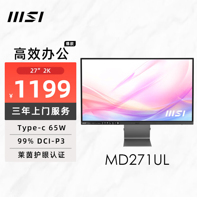 微星(MSI)27英寸 4K 65W Type-c 10Bit 99%DCIP3 莱茵低蓝光认证不闪护眼屏 微边框 家用办公显示器MD271UL价格:1399.00元!