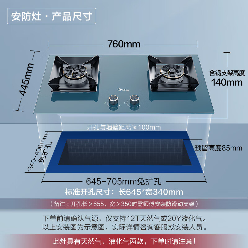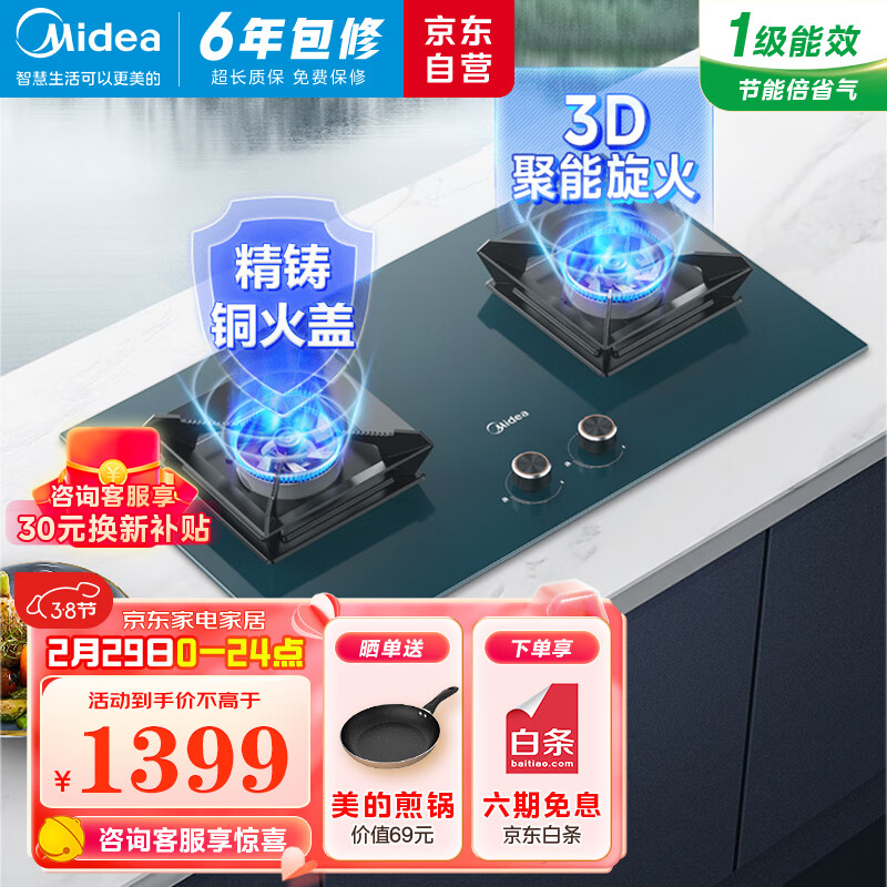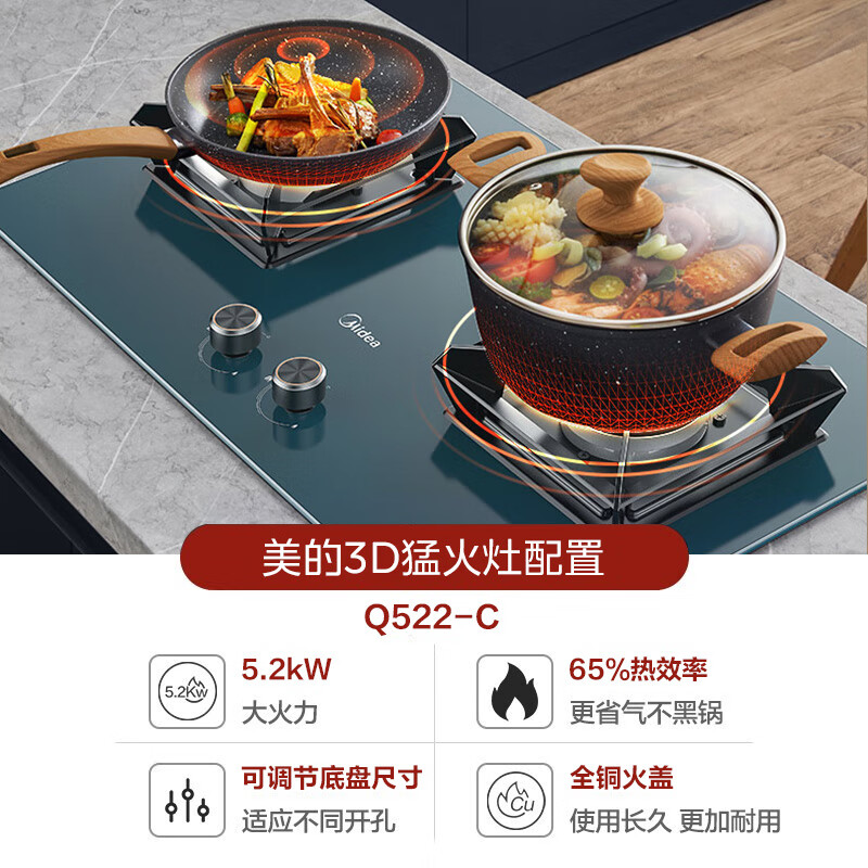 美的(Midea)燃气灶天然气煤气灶 双灶具 5.2kW猛火灶 大火力 一级能效 底壳可调 星空蓝 Q522-C价格:1399.00元!