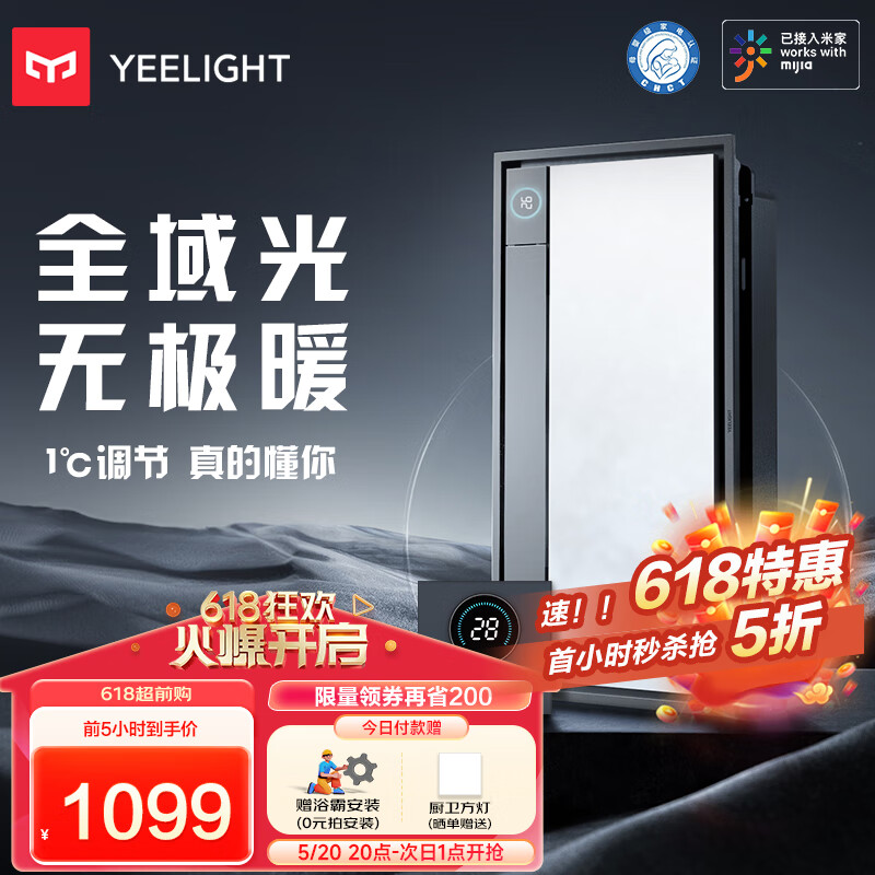 Yeelight智能浴霸S4双直流无极调温米家app控制集成吊顶浴霸风暖价格:2598.00元!