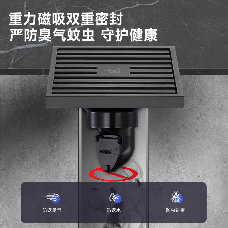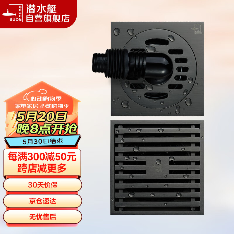 潜水艇(Submarine)黄铜镀镍枪灰色拉丝面50管防臭地漏套装 大排量淋浴+两用洗衣机价格:231.00元!