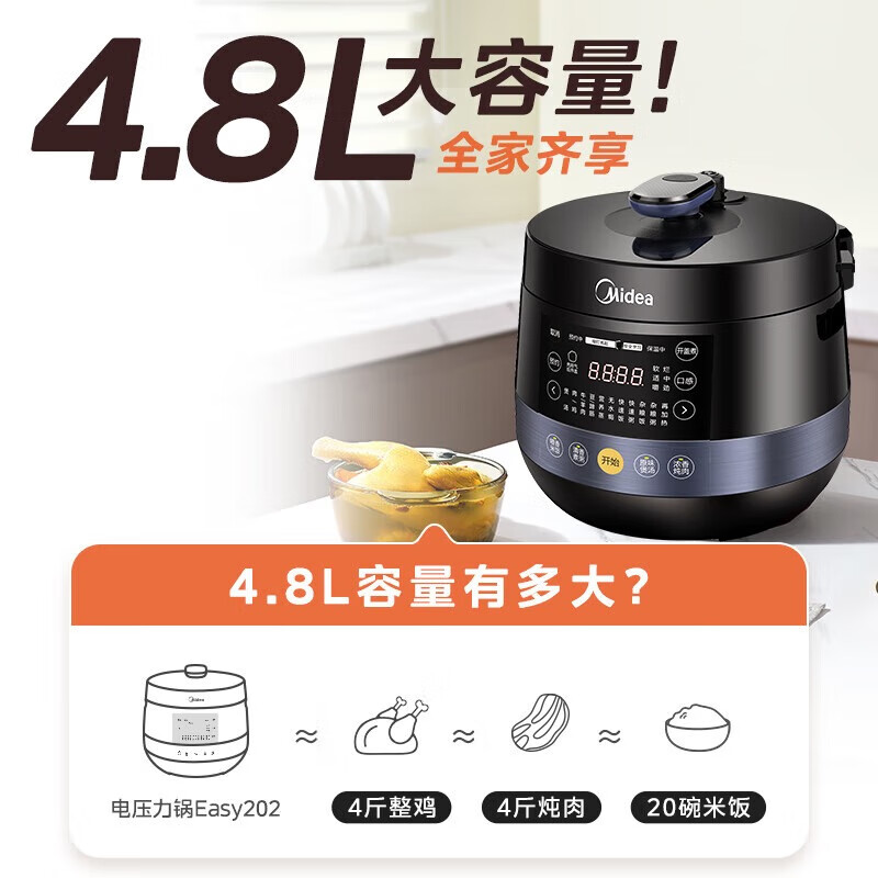 美的(Midea)电锅高压锅电饭煲一键排气家用电高压锅电饭锅双内胆球釜多功能预约定时MY-YL50Easy202 球釜双胆 3-8人 4.8L价格:519.00元!