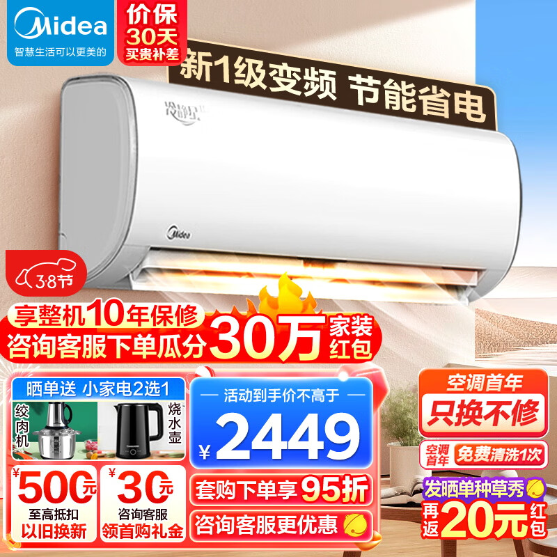 美的(Midea)空调 大1匹 冷静星 新一级能效变频冷暖 家用卧室空调挂机 KFR-26GW/BDN8Y-PH200(1)A价格:2449.00元!