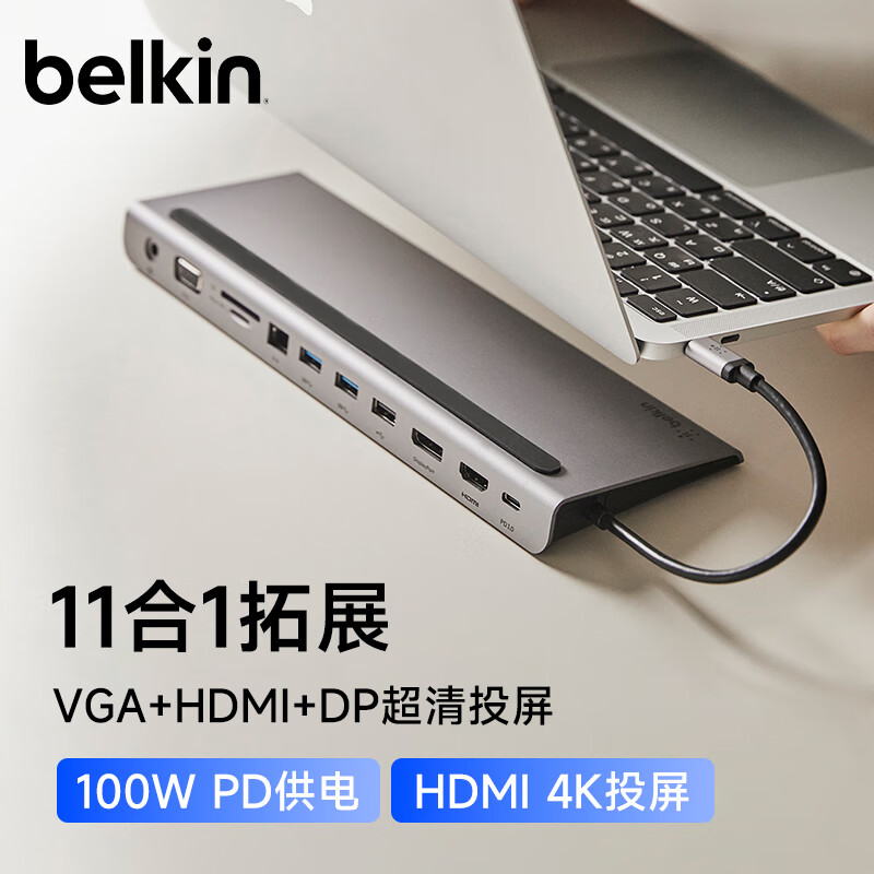贝尔金(BELKIN)11合1扩展 Type-C拓展坞 笔记本支架电脑转接器 PD供电 TF/SD读卡 HDMI/网口/VGA 兼容雷电充电器价格:703.00元!