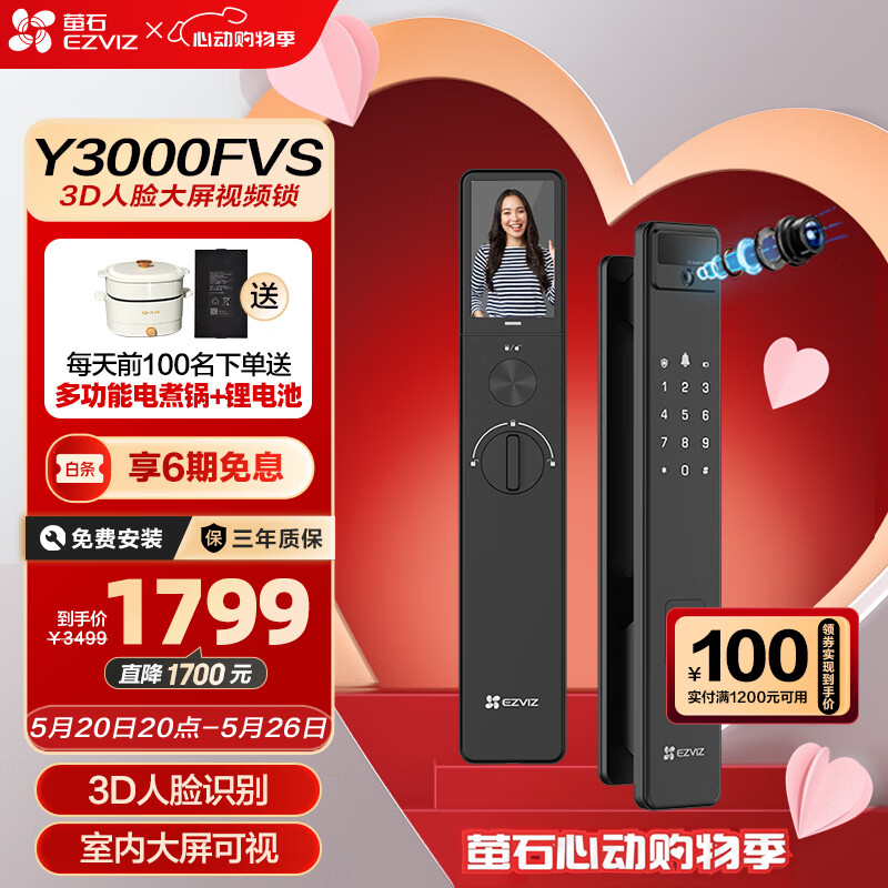 萤石Y3000FVS智能锁 静谧黑 3D人脸识别无需指纹 室内4英寸可视大屏 家用全自动猫眼门铃防盗视频锁价格:1799.00元!