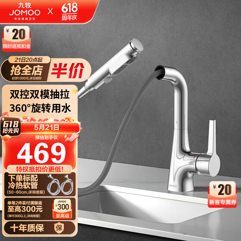 九牧(JOMOO)多功能抽拉式可旋转一键止水双控面盆龙头 32397-594/1B-Z价格:519.00元!