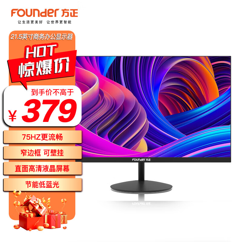 方正(Founder)21.5英寸 电脑显示器 75Hz 窄边框 可壁挂 商务办公 直面高清液晶屏幕 节能低蓝光FC2253D价格:429.00元!