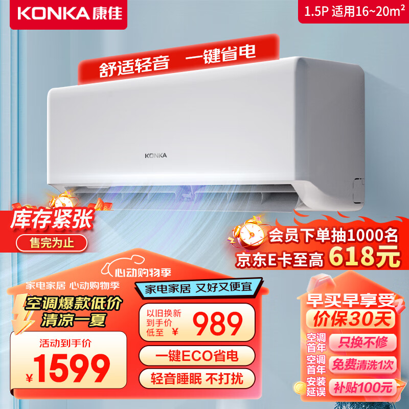 康佳(KONKA)1.5匹 新能效 快速冷暖 一键节能 变频壁挂式空调挂机 以旧换新 KFR-35GW/Y3价格:1599.00元!