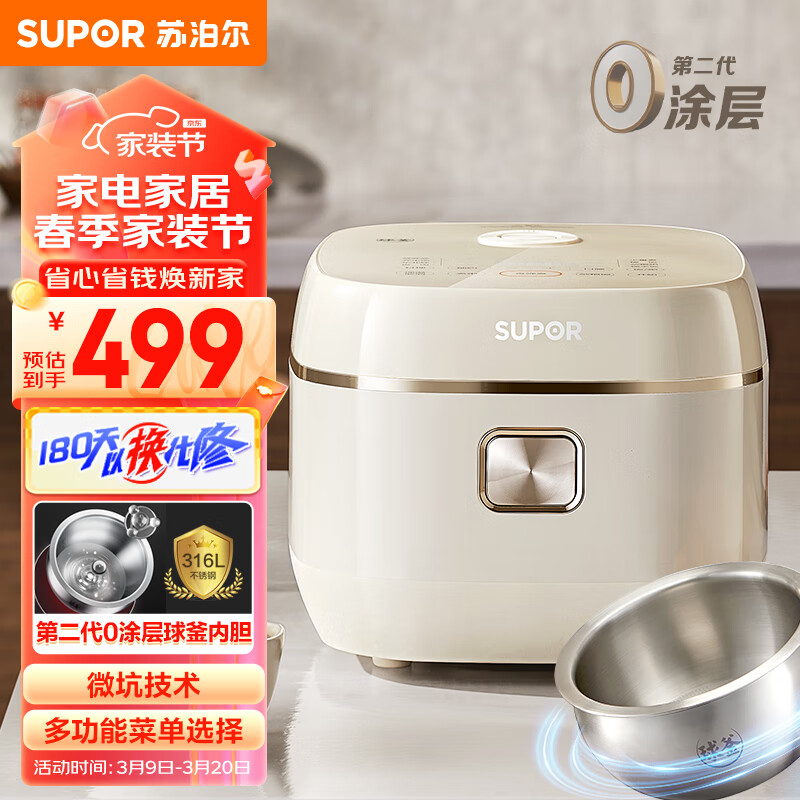 苏泊尔(SUPOR)电饭煲 电饭锅 4L IH电磁加热 0涂层316L不锈钢球釜内胆 家用大火力智能SF40HC0994价格:499.00元!