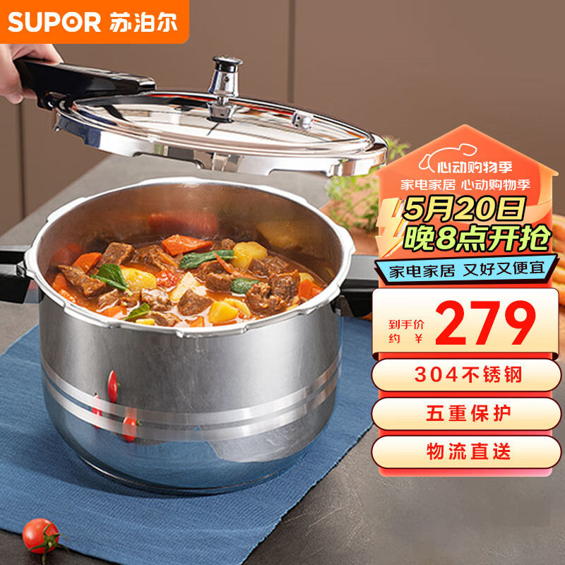 苏泊尔SUPOR高压锅304不锈钢7.0L锅24cm高压锅燃气电磁炉通用YS24ED价格:276.00元!