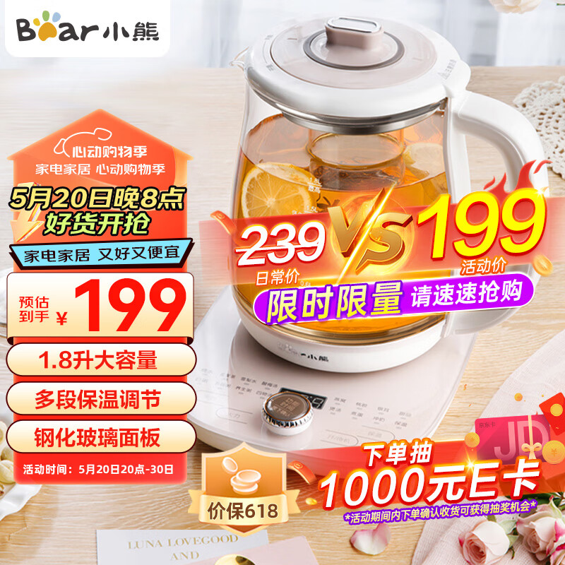 小熊(Bear)养生壶热水壶煮茶器 煮茶壶 电水壶 恒温电热水壶 保温花茶燕窝壶 YSH-C18S2带炖盅1.8L 烧水壶价格:199.00元!