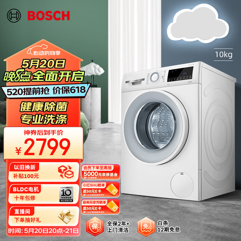 博世(BOSCH)【云朵白·极速版】家用滚筒洗衣机全自动10公斤大容量变频 除菌除螨 快洗 羊毛洗护 WGA152000W价格:3099.00元!