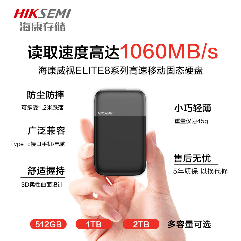 HIKVISION海康威视 1TB NVMe 移动固态硬盘(PSSD)Type-c USB3.2接口 手机直连 高速1060MB/s Elite8系列价格:599.00元!