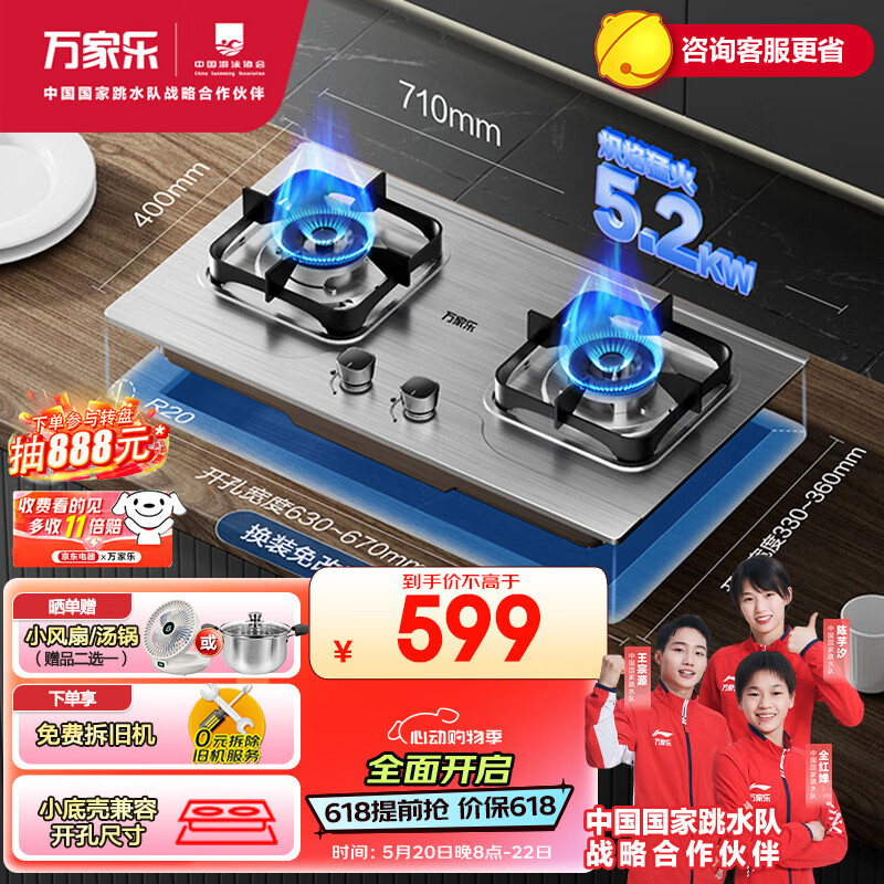 万家乐燃气灶 5.2kW天然气灶不锈钢猛火灶高热效率全进风快速点火燃气灶家用台嵌两用双灶JZT-AY8G天然气价格:699.00元!