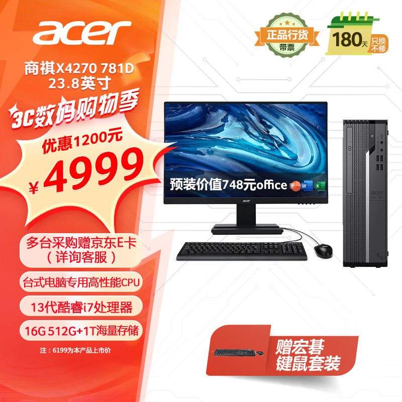 宏碁(acer)商祺X4270 781D 23款商用办公电脑台式主机 (酷睿13代i7-13700 16G 512G+1T) 23.8英寸显示器套机价格:4999.00元!