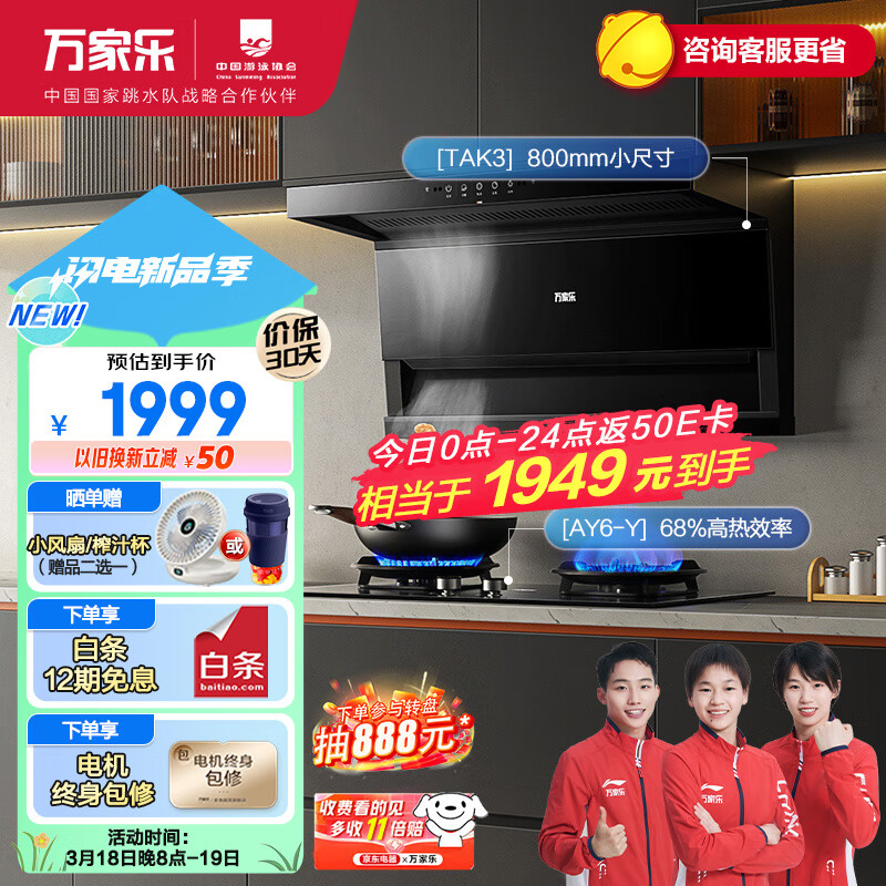 万家乐顶侧双吸油烟机 23立方小尺寸抽油烟机灶具套装 68%高热效率挥手自清洗烟灶套装TAK3+AY6液化气价格:2099.00元!
