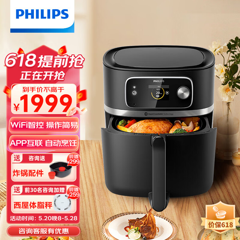 飞利浦(PHILIPS)全新变速空气炸锅8.3L大容量智能烹饪精准控温不用翻面APP智能菜谱多功能烤箱百变空气锅HD9880价格:1999.00元!