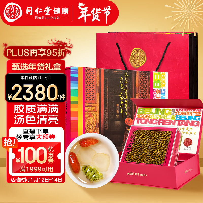 北京同仁堂【年货礼品】铁皮石斛一级3#/100克礼盒装 浙江铁皮石斛 胶质饱满滋补品送礼 可磨粉价格:2330.00元!