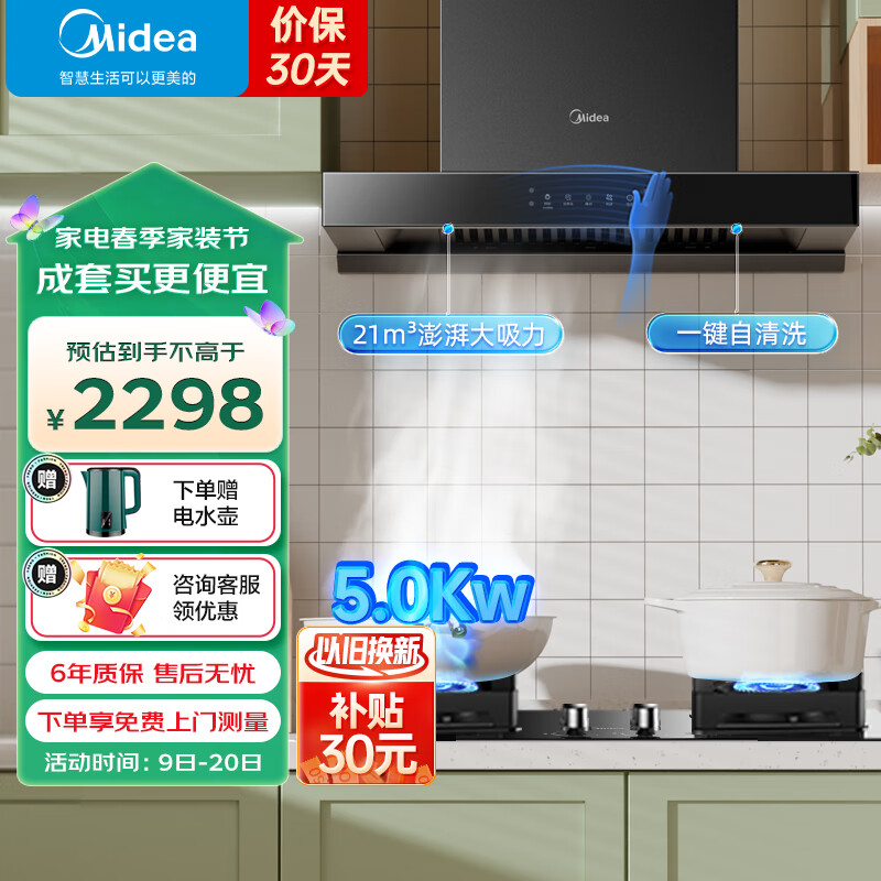 美的(Midea)欧式顶吸式抽油烟机家用21立方吸力700mm小尺寸自清洗挥手控制吸油烟机TN202+5.0KW定时灶[家电]价格:2298.00元!