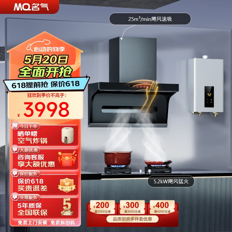 名气(MQ)老板抽油烟机7字型家用顶侧双吸变频25吸力燃气热水器烟灶热三件套A5508+A6510BT+R5A06-14价格:3998.00元!