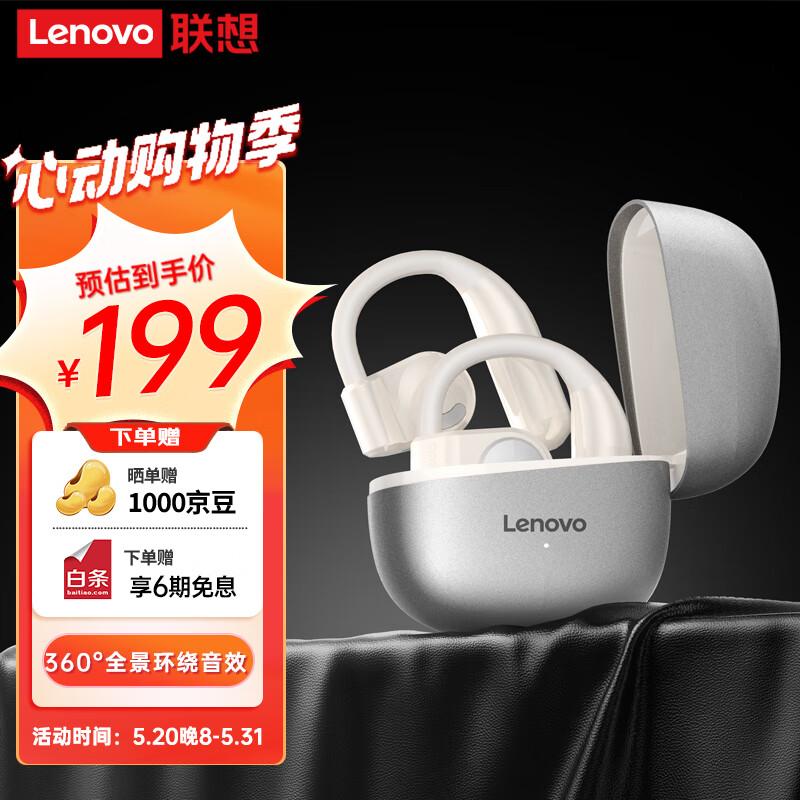 联想(lenovo)蓝牙耳机挂耳式骨传导概念开放式真无线不入耳舒适运动跑步通话降噪适用于苹果华为TC3401银白色价格:199.00元!