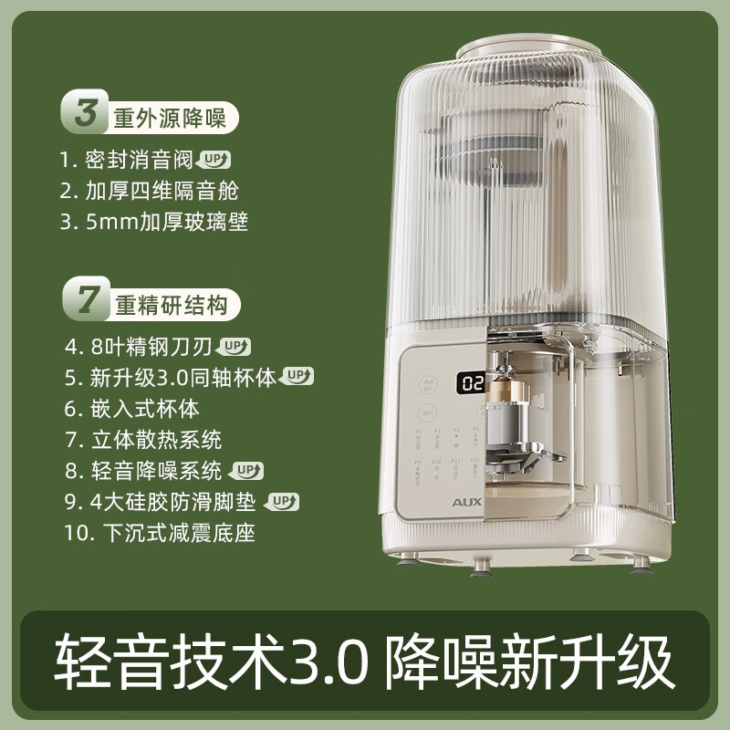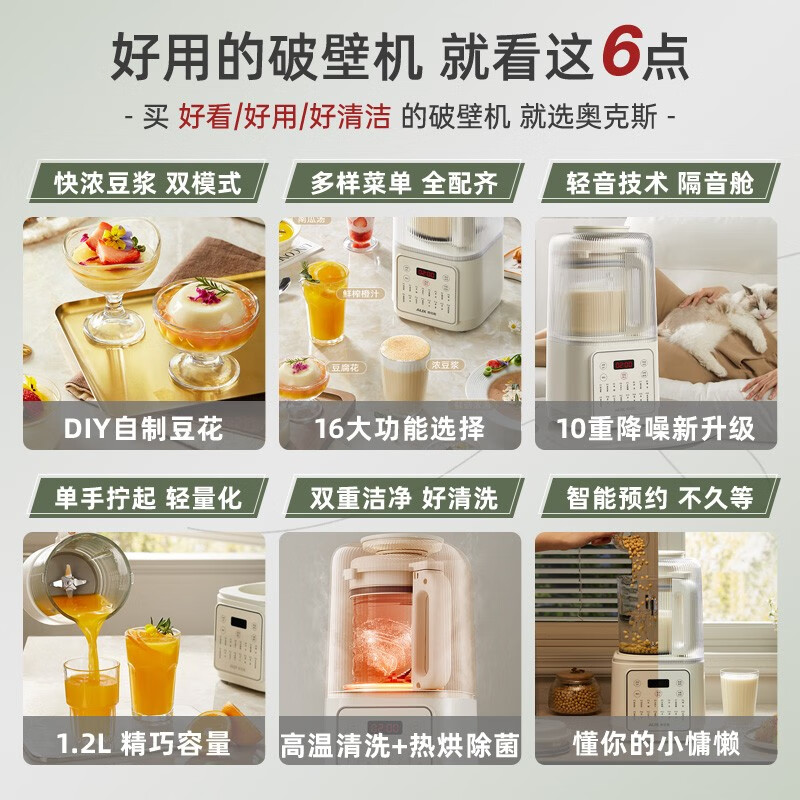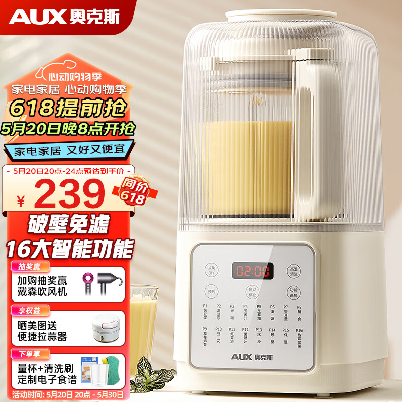 奥克斯(AUX)破壁机家用1.2L柔音豆浆机 加热全自动榨汁机 带隔音有罩搅拌机辅食机早餐机 HX-PB9788Z 典雅白价格:239.00元!