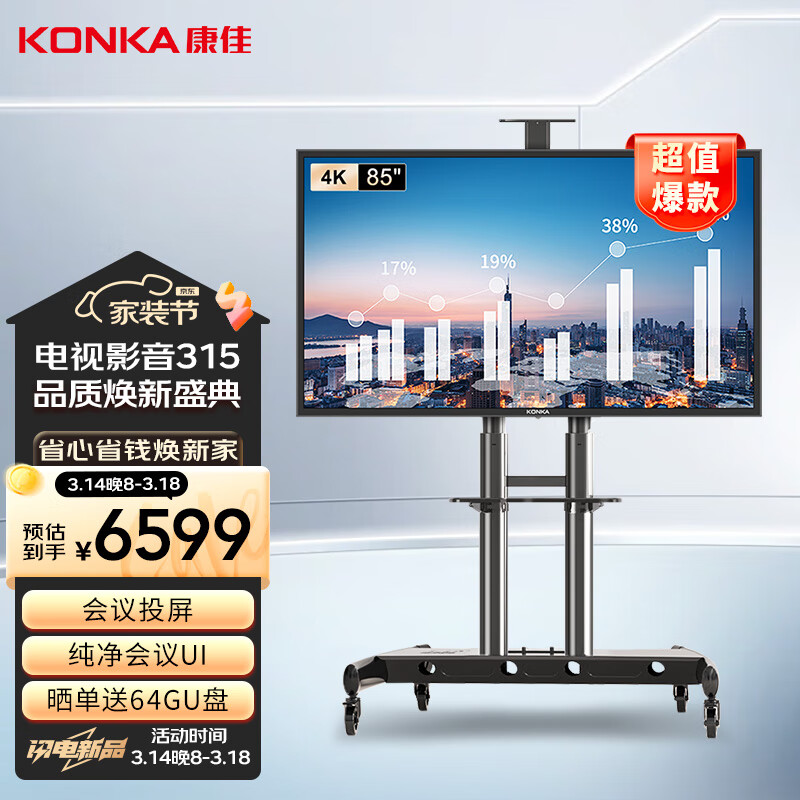 康佳(KONKA)会议电视85英寸办公平板一体机商用移动会议显示屏幕 投屏投影智慧屏 纯净会议UI 85K5+移动支架价格:6599.00元!