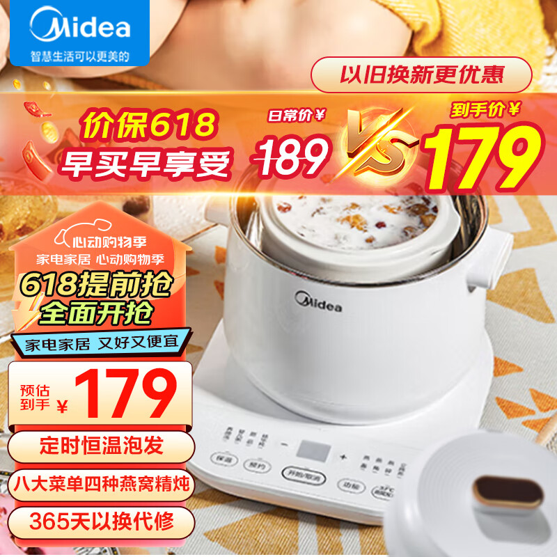 美的(Midea)电炖锅 燕窝炖盅煮粥隔水炖 0.8L 陶瓷内胆煲汤养生BB煲 智能预约 WBZS0801F 以旧换新价格:179.00元!