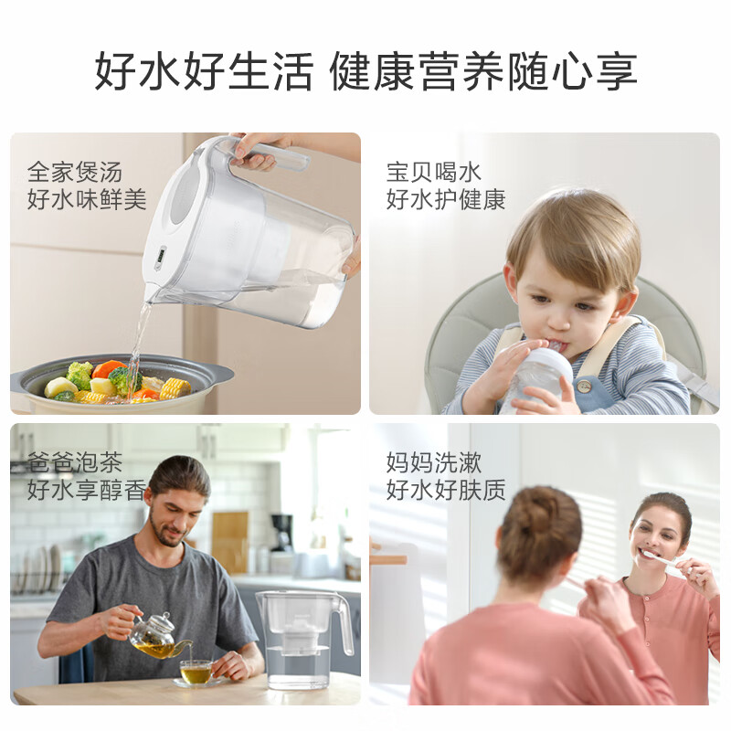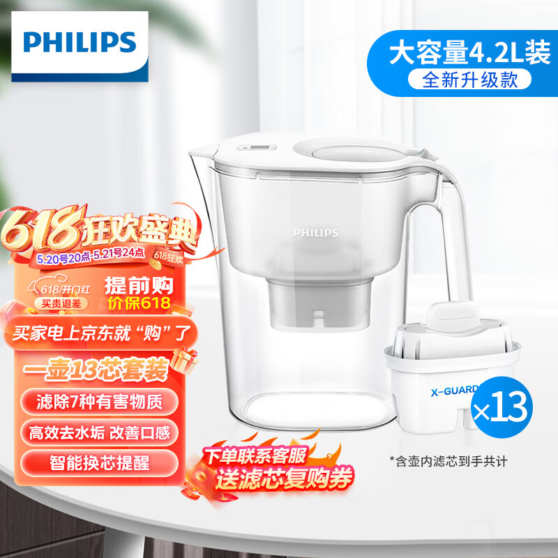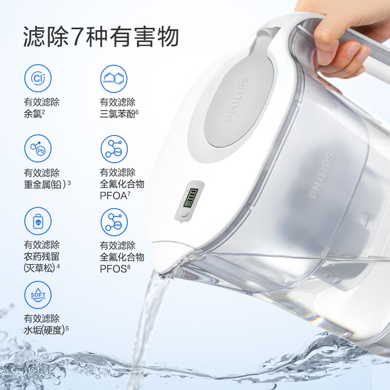 飞利浦(PHILIPS)全新升级净水壶 家用滤水壶 厨房自来水过滤净水器 AWP2814WHT 一壶13芯价格:309.00元!