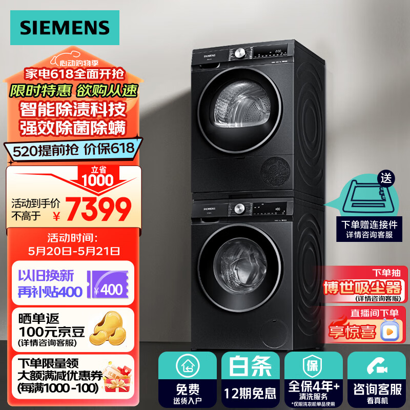 西门子(SIEMENS)iQ300曜石黑系列洗烘套装 10kg 智能除渍 滚筒洗衣机+10kg 羽绒服烘 618热泵烘干机 U20W+D20W价格:8399.00元!
