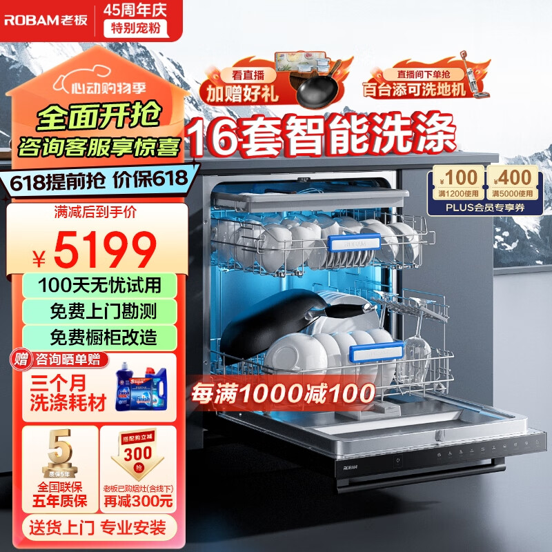 老板(Robam)WB797D 16套三层大容量嵌入式洗碗机去重油污会洗锅热风烘干消杀长效存储一体机家用快速洗价格:5699.00元!