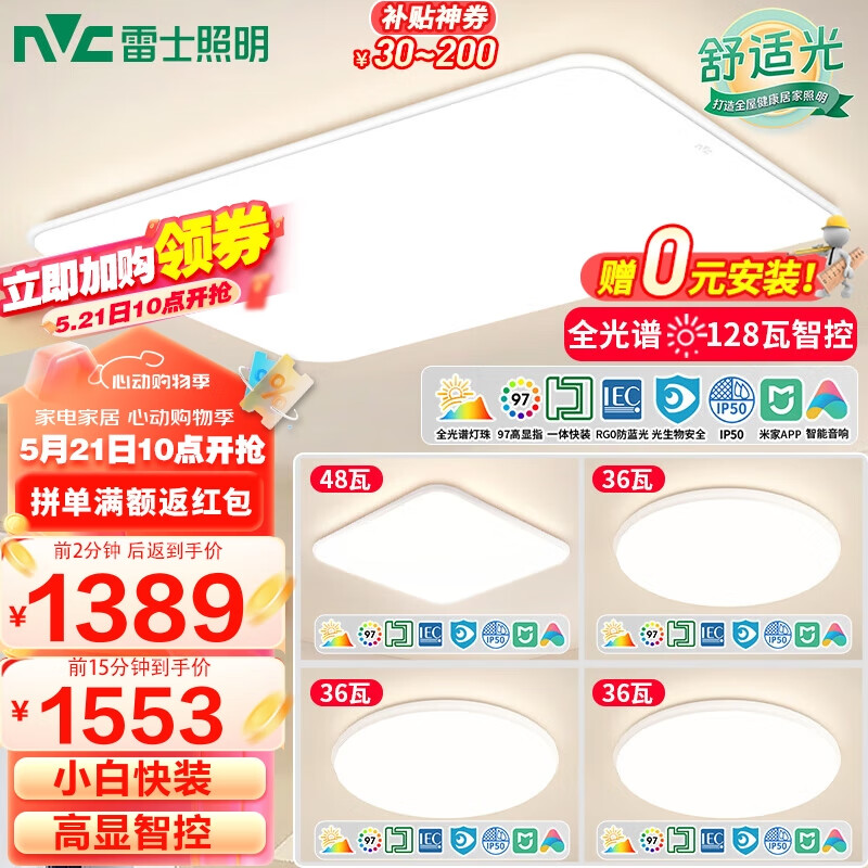 雷士(NVC)吸顶灯客厅大灯led奶油风米家智能全光谱护眼小白灯白雪S舒适光价格:2738.00元!