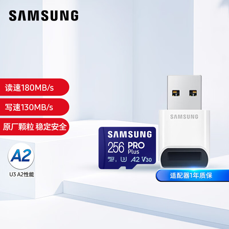 三星(SAMSUNG)256GB TF(MicroSD)存储卡Pro Plus 读速180MB/s写速130MB/s高速内存卡原装读卡器套装价格:239.00元!