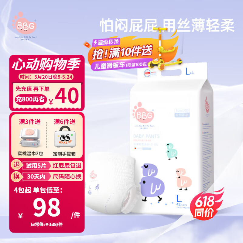 BBG蓝芯丝薄轻柔拉拉裤L码42片(8-10kg)尿不湿学步裤超薄干爽透气价格:122.00元!