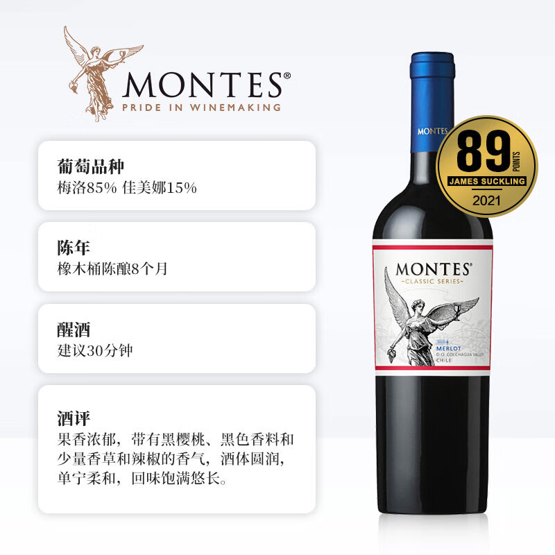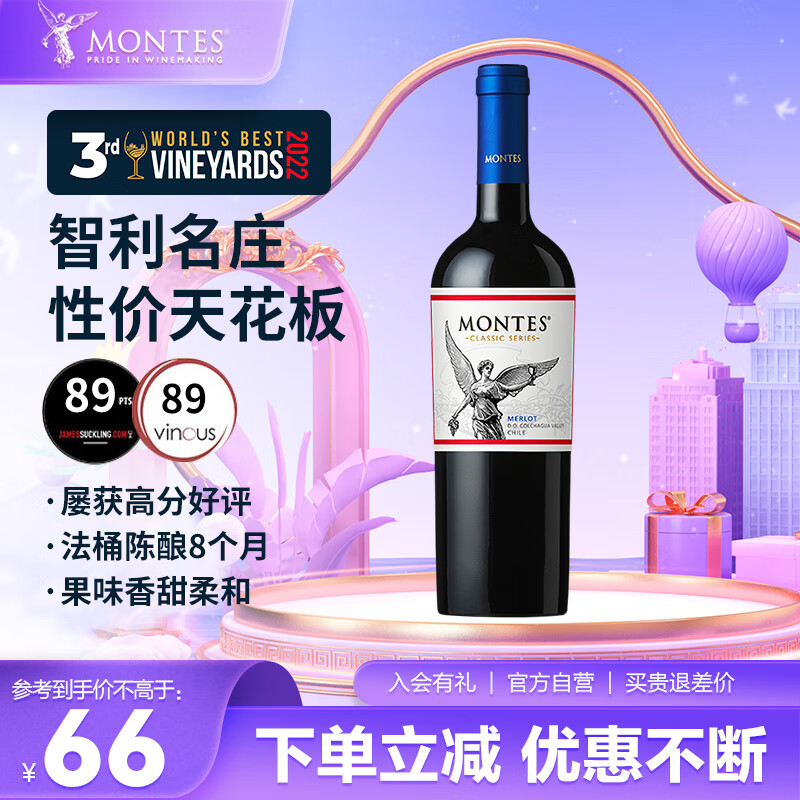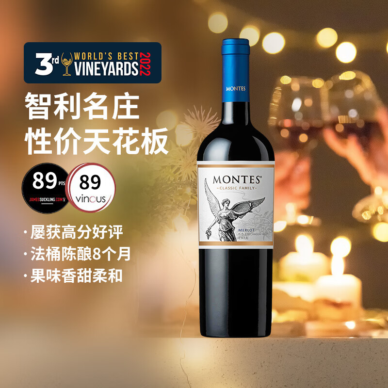 MONTES蒙特斯经典梅洛红酒葡萄酒750ml口粮晚安圣诞礼物智利原瓶进口价格:76.00元!
