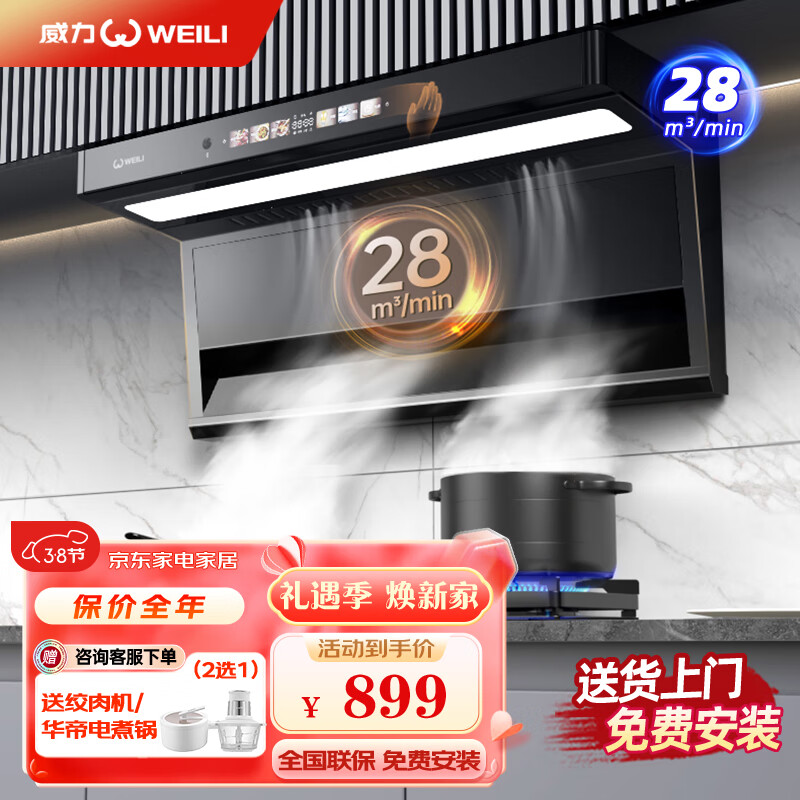 威力(WEILI)顶侧双吸油烟机7字型抽油烟机家用28m3大吸力自动清洗900mm彩屏语音体感吸烟机WLQ06价格:899.00元!