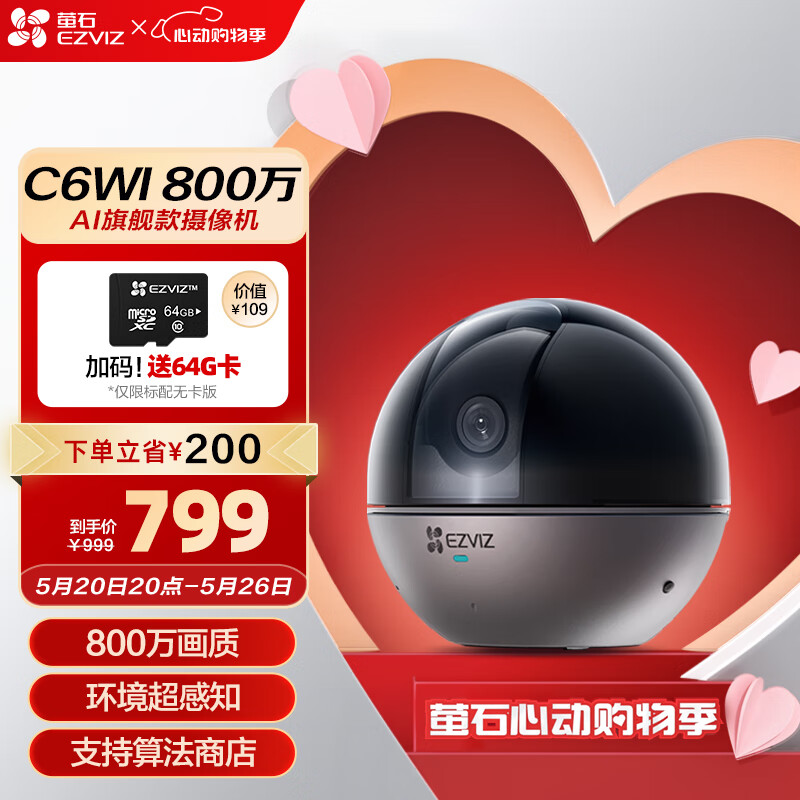 萤石(EZVIZ)C6WI智能4K超高像素 无线云台家用监控手机摄像头800万超清 婴儿看护器 内置8G存储价格:799.00元!
