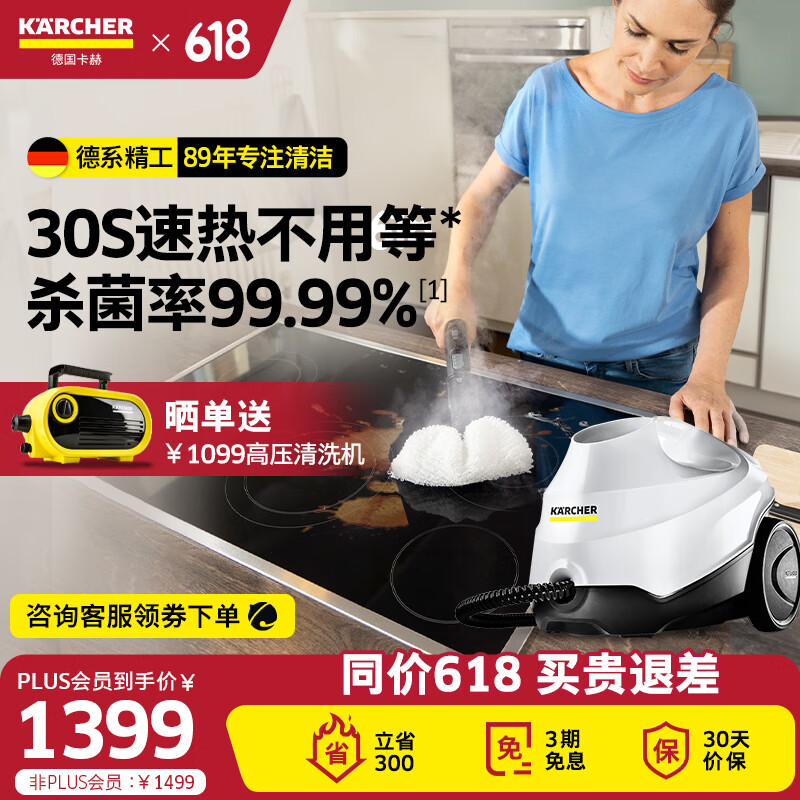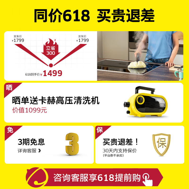 KARCHER德国卡赫 蒸汽拖把家用高压高温蒸汽清洁机厨房油烟机冰箱清洗机去油污30秒速热洗地机杀菌消毒SC3价格:1799.00元!