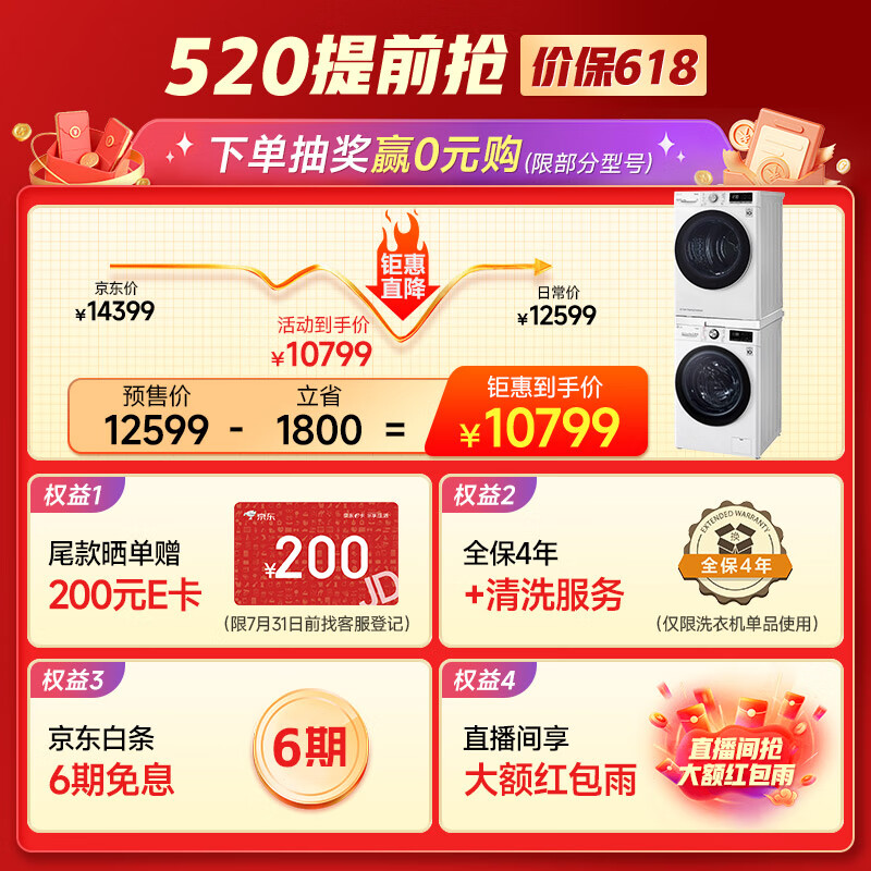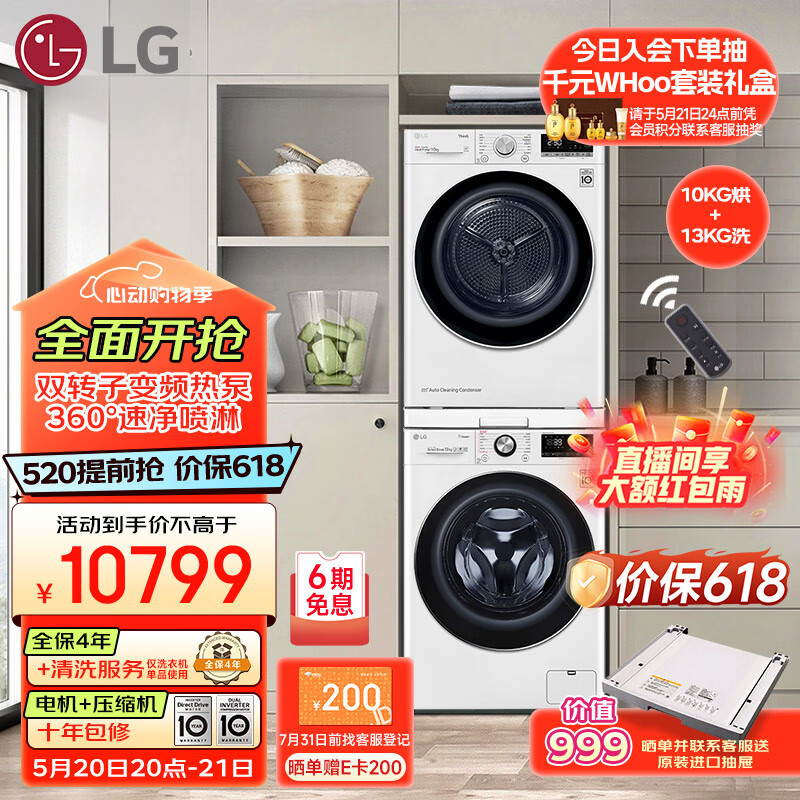 LG 容慧系列大容量洗烘套装13kg蒸汽除菌洗衣机+10kg原装进口变频热泵遥控FCV13G4W+RH10V9AV4W价格:12599.00元!