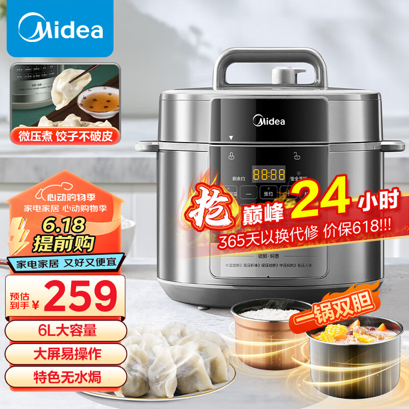 美的(Midea)饺子王系列 电锅6L家用全自动智能预约无水焗易清洁双胆大屏多功能高压锅MY-E6910(2-12人)价格:259.00元!