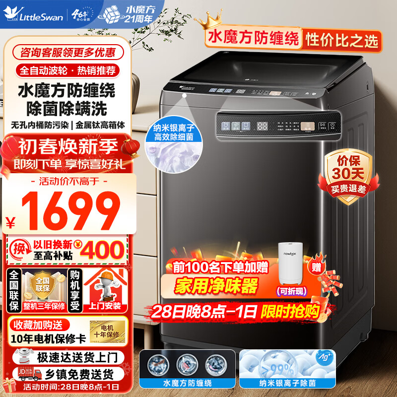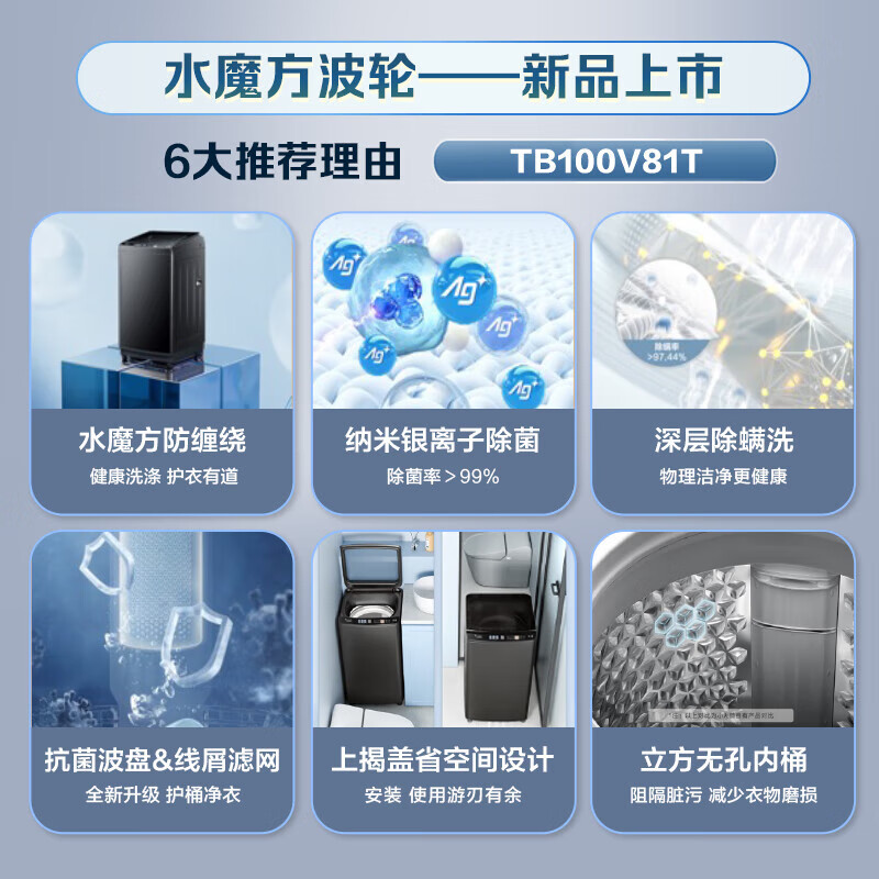 小天鹅(LittleSwan)波轮洗衣机全自动 水魔方系列 【TB100V81T】 防缠绕 纳米银离子除菌 深层除螨 无孔内桶 10公斤价格:1669.00元!