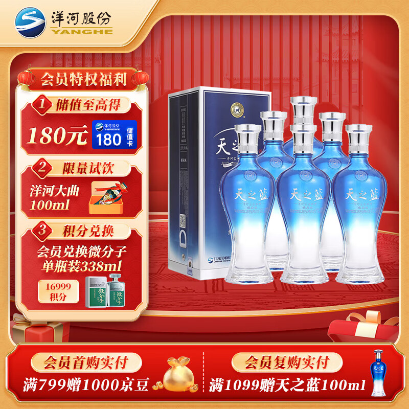 洋河 蓝色经典 天之蓝 42度 520ml*6瓶 整箱装 绵柔浓香型白酒 送礼价格:2208.00元!