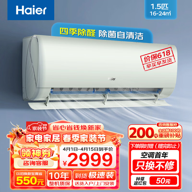 海尔(Haier)空调1.5匹劲爽除醛版 新一级能效变频 四季除醛 冷暖 卧室壁挂式空调挂机 以旧换新价格:2999.00元!
