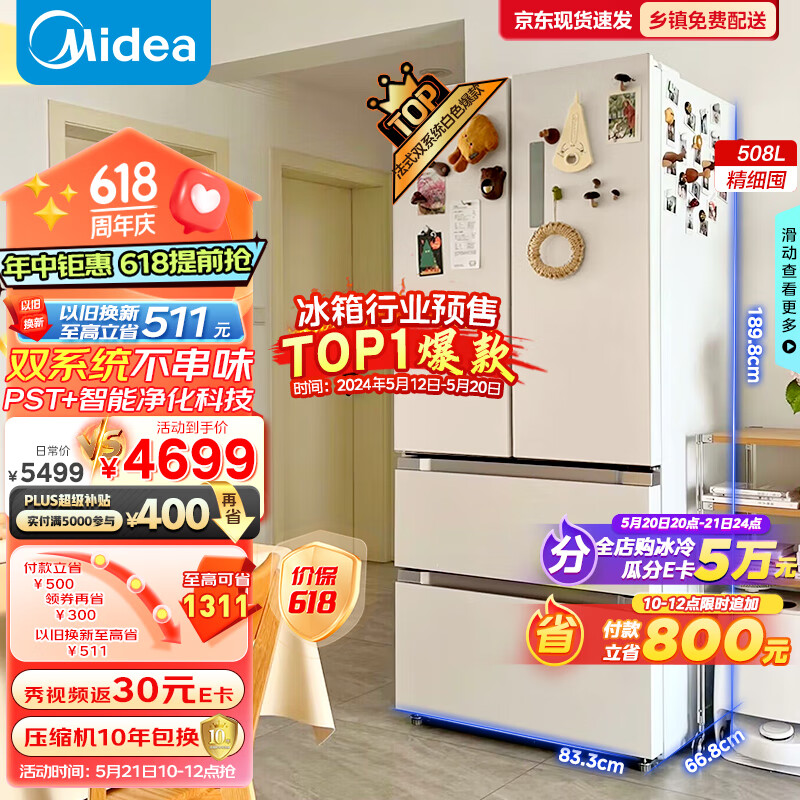 美的(Midea)19分钟急速净味508升变频一级能效法式四开门多门双系统双循环家用冰箱大容量BCD-508WTPZM(E)白色价格:5499.00元!