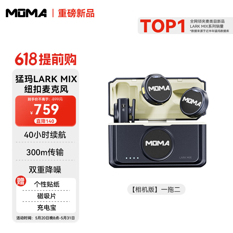 猛玛(MOMA)Lark Mix 一拖二无线领夹麦克风猛犸相机直播vlog户外采访微小型纽扣收音麦相机版黑色价格:759.00元!