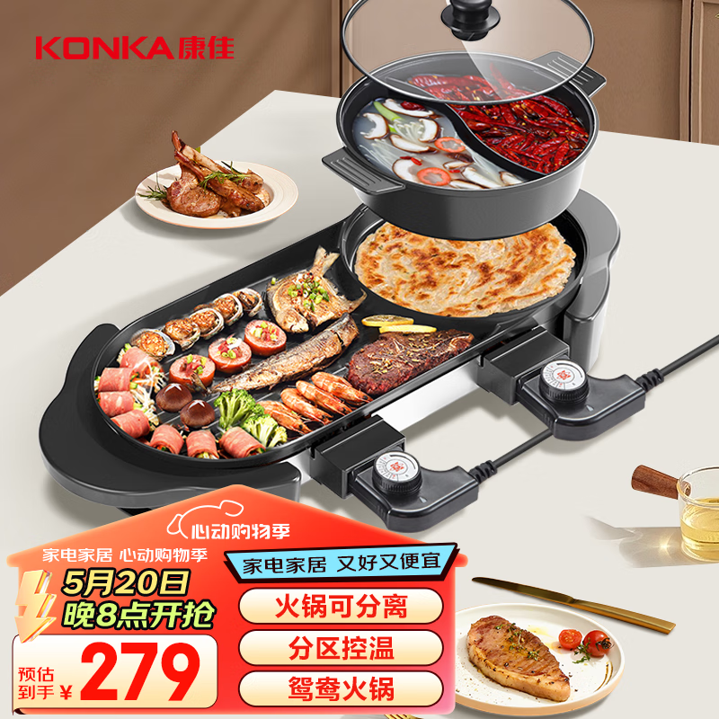 康佳(KONKA)电烧烤炉 多功能鸳鸯电火锅涮烤一体锅家用电烤炉烤涮锅 双温控可分离 KEG-W006价格:279.00元!
