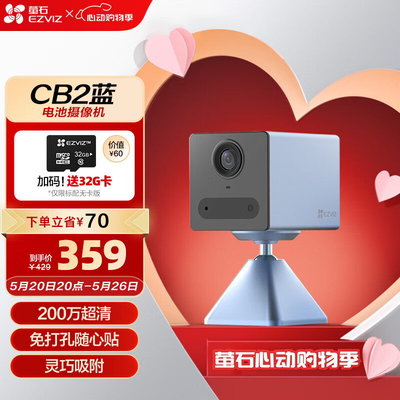 萤石 CB2 全无线监控摄像头 200万像素1080P电池相机 网络摄像机 免打孔 灵巧吸附 冰晶蓝价格:359.00元!