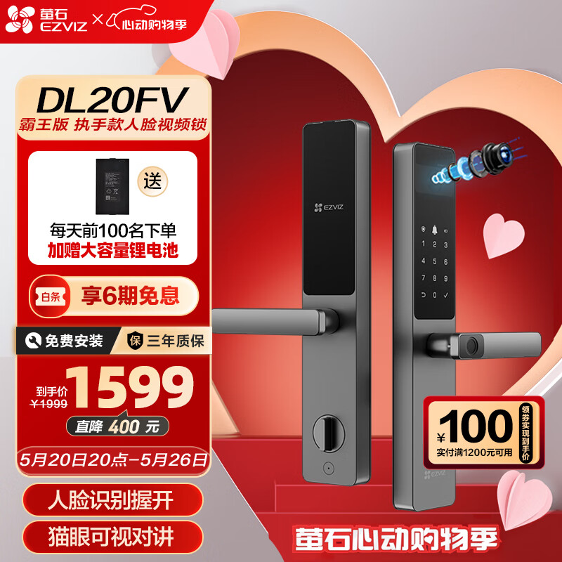 萤石DL20FV智能人脸视频锁 霸王锁 3D人脸识别指纹握开式视频锁 家用全自动智能猫眼门铃防盗电子门锁价格:1599.00元!